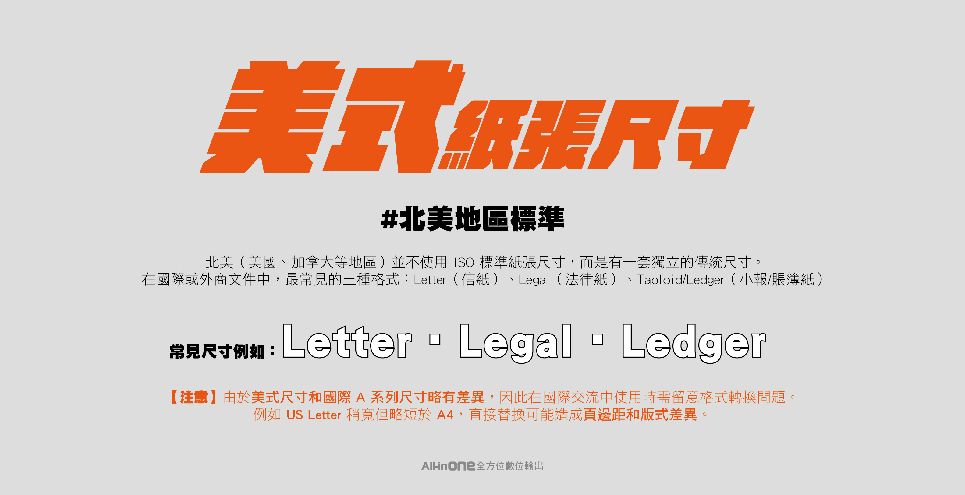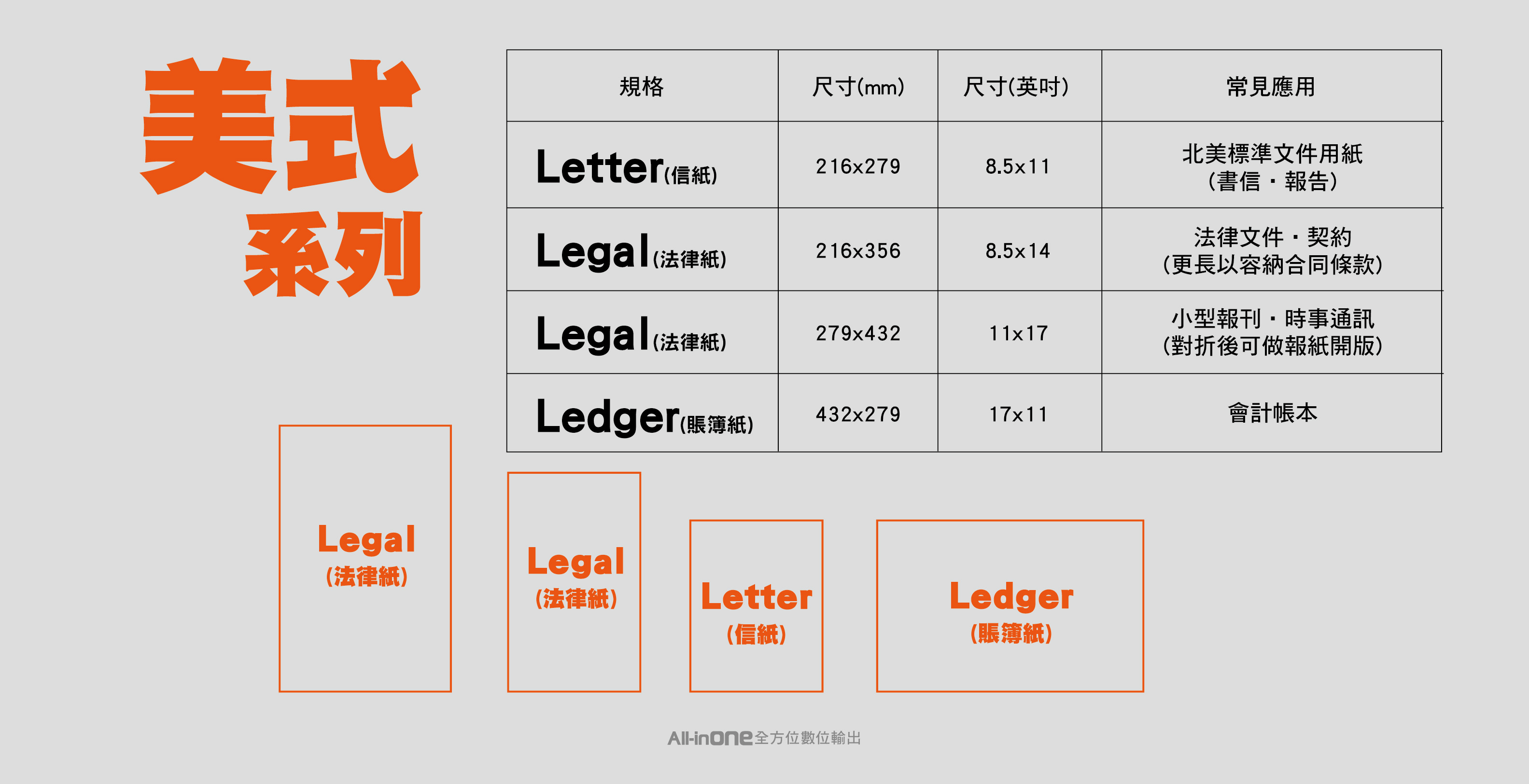 ★常見尺寸:Letter(美國最常見的文件尺寸)、Legal(常用於法律文件)、Ledger(接近 A3尺寸)